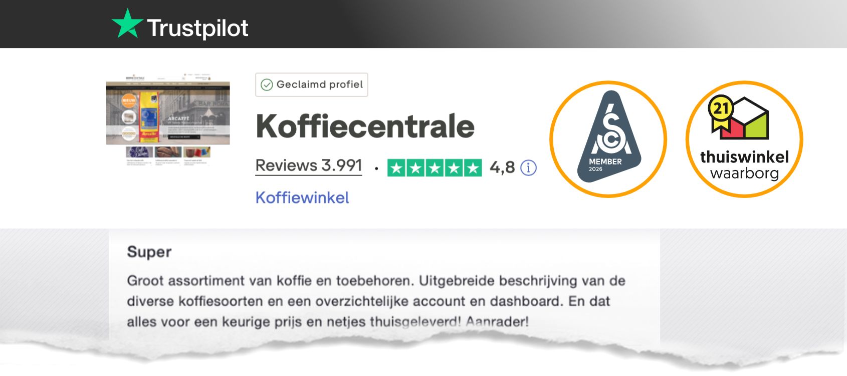 We willen graag dat je tevreden bent over de koffie en over onze dienstverlening. Niet voor niets zijn al onze bestaande klanten erg enthousiast. We besteden veel aandacht aan onze diensverlening en aan de selectie van onze producten. We zijn vanaf het prille begin aangesloten bij thuiswinkel.org. Sinds 2014 vragen we (maximaal 1x per jaar) een beoordeling via Trustpilot. Na meer dan drieduizend beoordelingen kunnen gerust zeggen dat we het "best gewaardeerde koffiebedrijf" van Nederland zijn. Jouw bestelling is bij ons in goede handen.