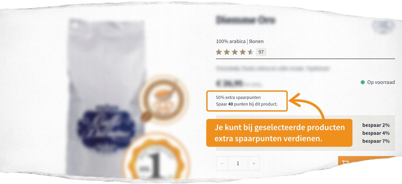 Bij bestellen van producten verdien je automatisch spaarpunten. Iedere euro die je besteedt, is 1 spaarpunt waard. Je kunt bij geselecteerde producten, bijvoorbeeld koffie die we zelf uit Italië importeren, extra spaarpunten verdienen. Dit staat dan aangegeven bij het product. Spaarpunten kunnen ingewisseld worden bij een bestelling vanaf 75 euro.