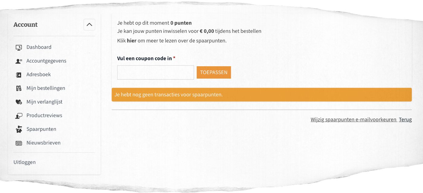 In je account onder "spaarpunten" kun je zien wat je saldo is, wanneer je spaarpunten hebt verzilverd en bij welke bestelling. Ook kun je je aanmelden voor spaarsaldo-updates onder "e-mailvoorkeuren".