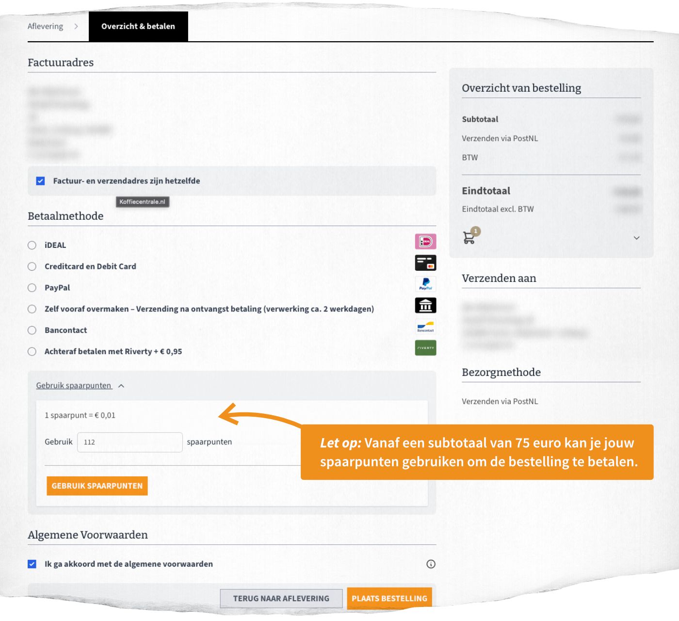 Als je je aanmeldt als nieuwe klant, dan ontvang je eenmalig 500 spaarpunten (=€5,00 aan waarde). Ga hiervoor naar "registreer", helemaal bovenaan rechts in je scherm of plaats een bestelling en kies voor "nieuw bij Koffiecentrale?". Met een eigen account hoef je niet bij elke volgende bestelling je gegevens opnieuw in te vullen. De gebruikersnaam van je persoonlijke account is je e-mailadres. Het wachtwoord bedenk je zelf. Eenmaal ingelogd kun je eenvoudig de status van je bestelling volgen, je bestelhistorie bekijken of je persoonlijke gegevens of het wachtwoord van je account wijzigen.